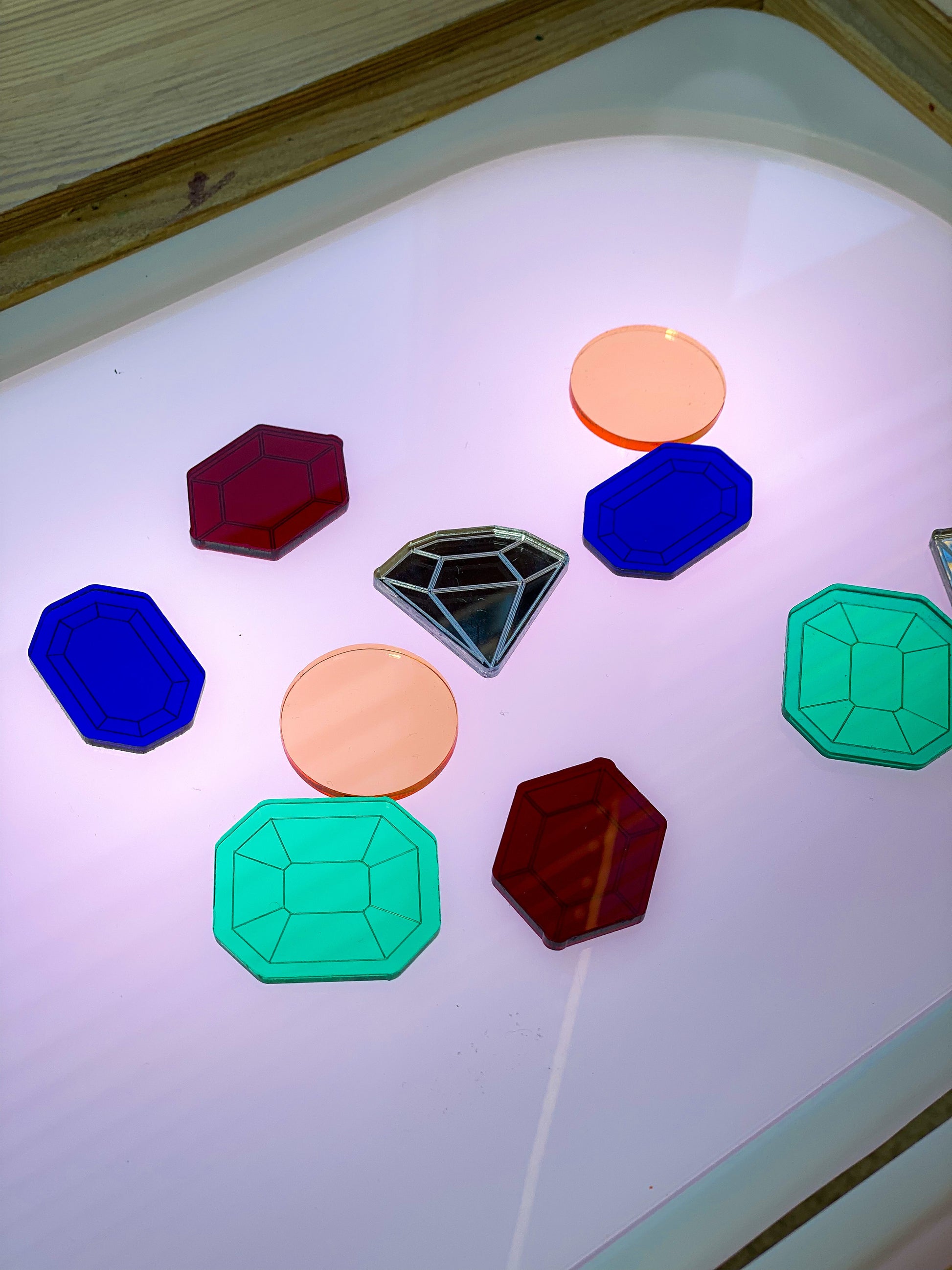 Acrylic pieces include 2 gold coins, 2 emeralds, 2 rubies, 2 sapphires, and 2 diamonds.